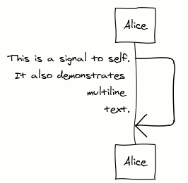 Alice->Alice: This is a signal to self.\nIt also demonstrates \nmultiline \ntext.
